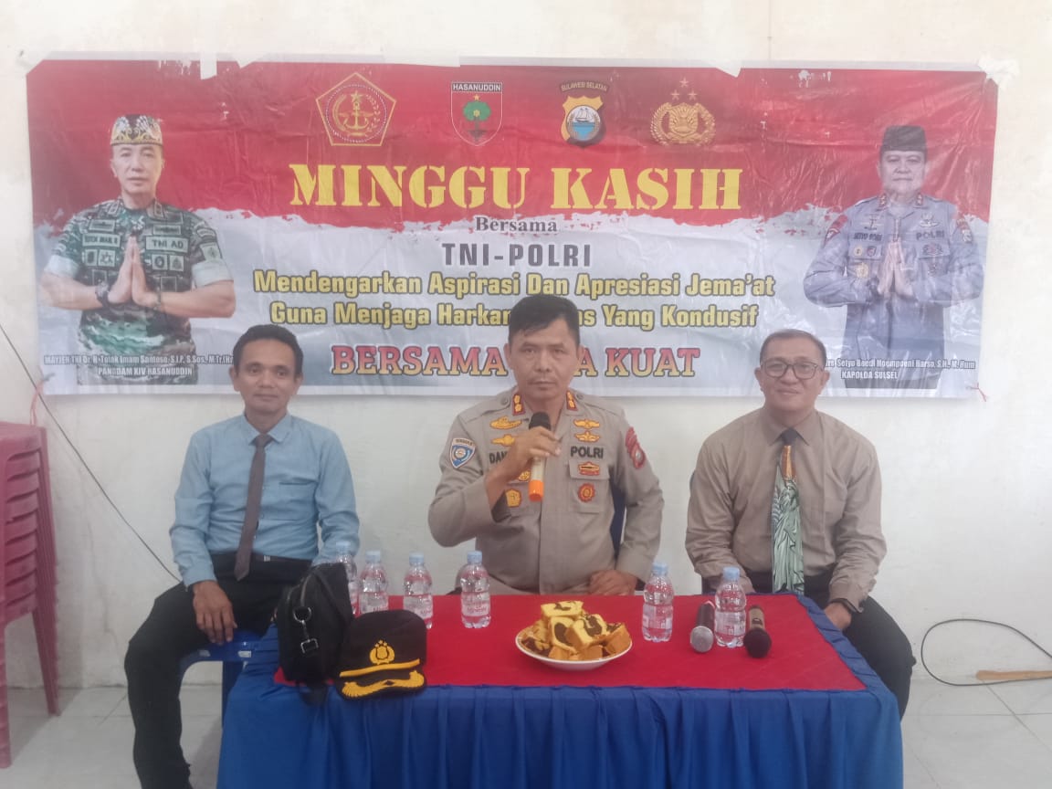 Kegiatan Minggu Kasih dalam rangka membangun sinergitas dengan Masyarakat khususnya Jemaat Sudiang Kota Makassar sekaligus mendengarkan keluhan, saran serta kritik, untuk membangun kinerja Polri yang lebih baik.