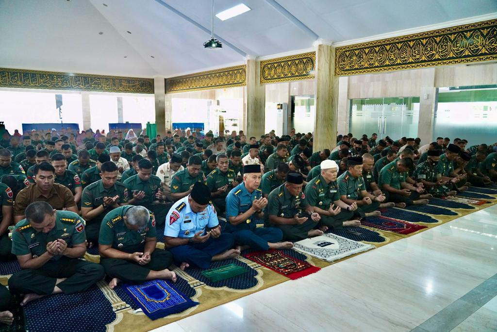 SATYA BHAYANGKARA MAKASSAR — Menjelang Hari Ulang Tahun (HUT) ke-78 TNI Tahun 2023, Pangdam XIV/Hasanuddin Mayjen TNI Dr. Totok Imam Santoso, S.I.P., S.Sos., M.Tr (Han)., memimpin kegiatan doa bersama secara serentak, yang diikuti oleh Prajurit dan PNS Kodam XIV/Hasanuddin. Senin (2/10/2023).