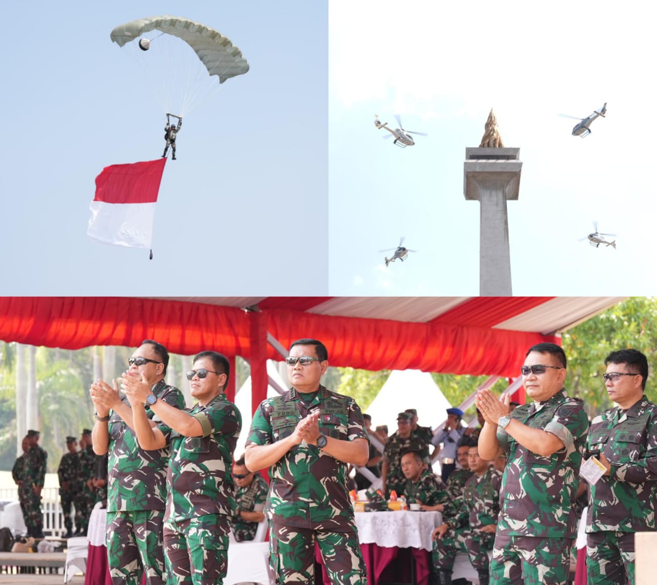 SATYA BHAYANGKARA JAKARTA — [ Puspen TNI ] – Panglima TNI Laksamana TNI Yudo Margono, bersama Kasad Jenderal TNI Dr. H. Dudung Abdurachman, Kasal Laksamana TNI Muhammad Ali, dan Kasau Marsekal TNI Fadjar Prasetyo, menyaksikan Gladi Bersih Upacara Parade dan Defile HUT Ke-78 TNI Tahun 2023, di Silang Monas, Jakarta Pusat, Selasa (3/10/2023).