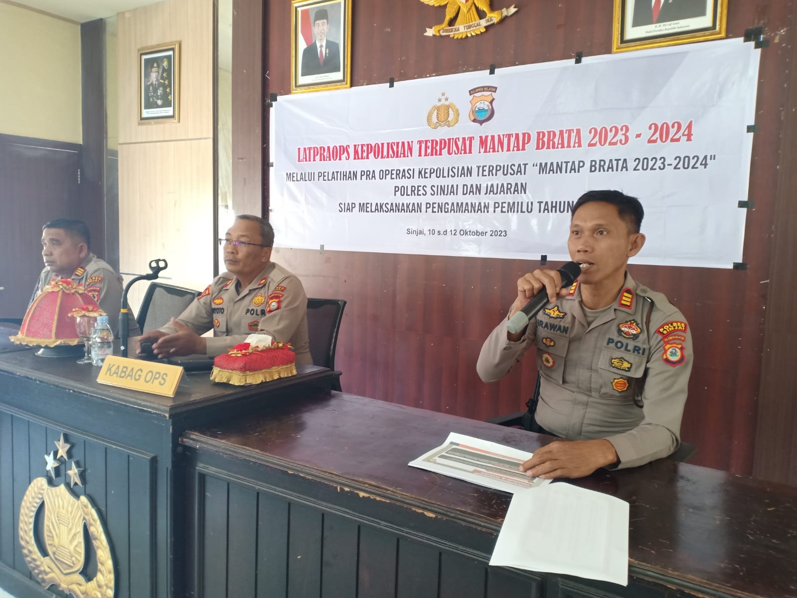 Kapolres Sinjai Akbp Fery Nur Abdulah, S.Ik melalui Kabag Ops Polres Sinjai Kompol Sunyoto, S.Sos mengungkapkan bahwa Latihan Pra Operasi Mantap Brata 2023-2024 digelar selama tiga hari dengan Tema “Melalui Pelatihan Pra Operasi Kepolisian Terpusat Mantap Brata 2023-2024 Polres Sinjai dan Jajaran Siap Melaksanakan Pengamanan Pemilu 2024.