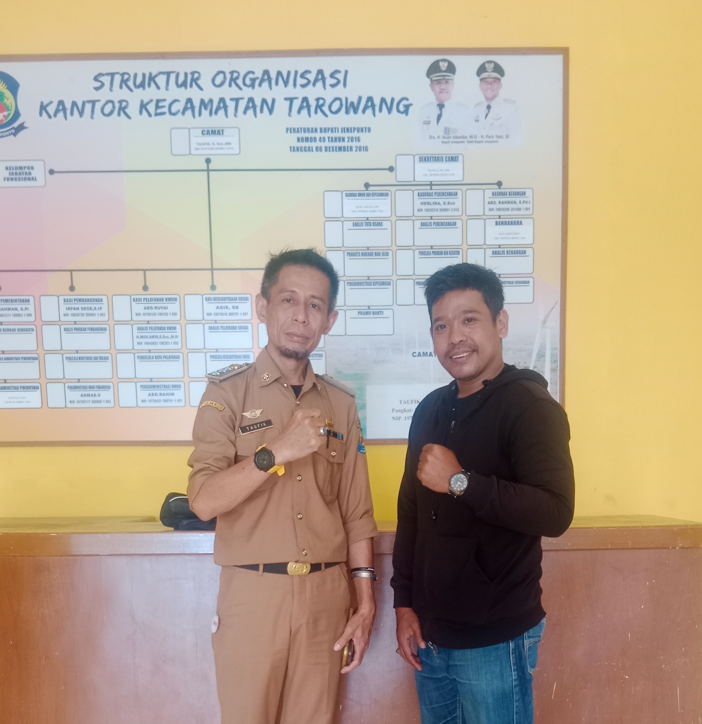 SATYA BHAYANGKARA JENEPONTO — Kunjungan Silaturahmi Irsan Hb selaku pimpinan perusahaan Media, Putra Prayudha Rezki, Kekantor Kecamatan Tarowang disambut Langsung oleh Taufik, Camat Tarowan beserta stafnya Diruang Aula. Dalam kunjungan Irsan Hb Sekedar Silahturrahmi dan bekerja sama antara pemerintah dengan Media. Didalam menyukseskan Pemilu 2024_2029, Ditarowang Jeneponto, Sul-sel, Selasa 30/01/2024.