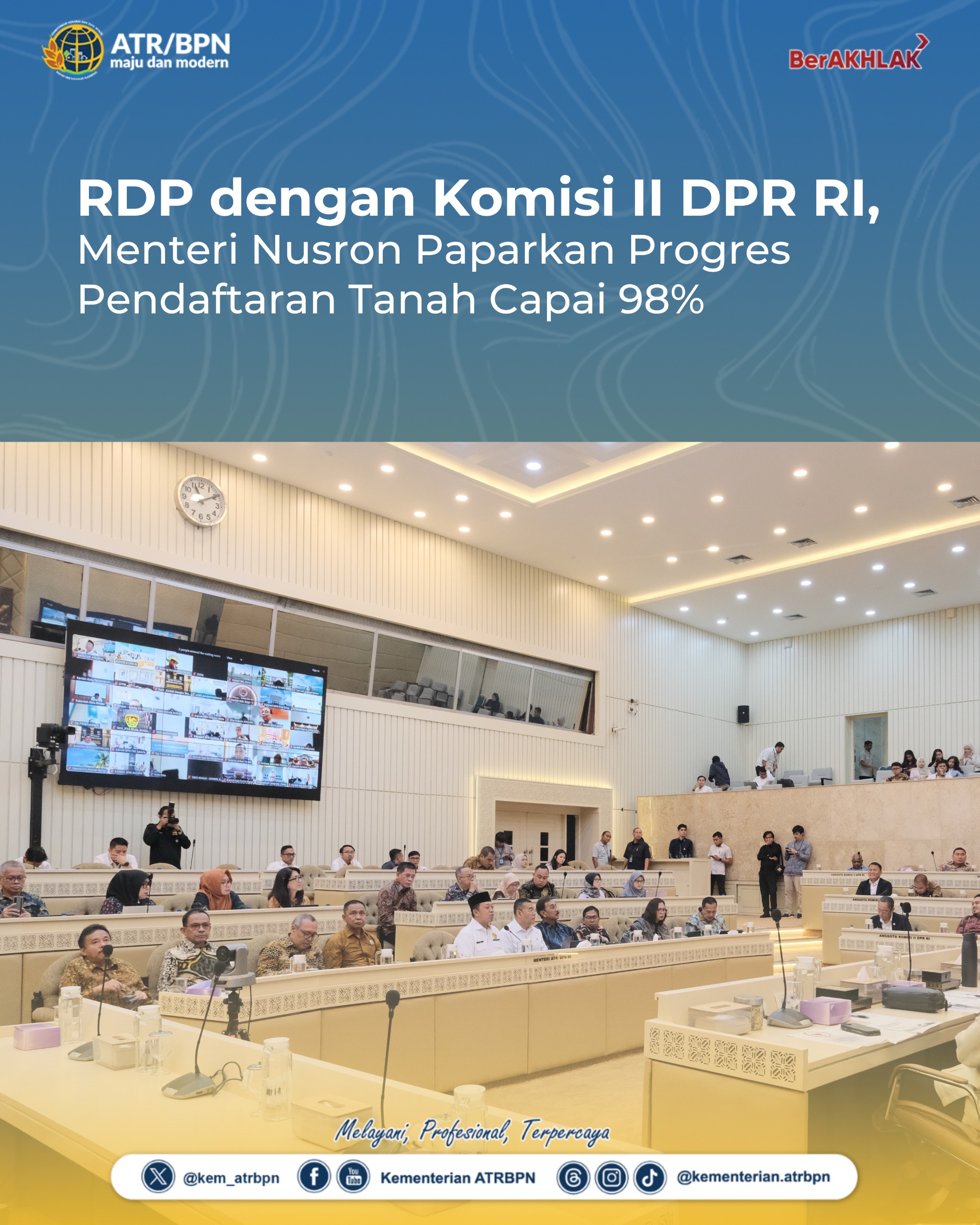 “Peningkatan pendaftaran tanah meliputi bidang tanah terdaftar dan bidang tanah bersertipikat. Sampai saat ini, kita telah melakukan pendaftaran tanah sebanyak 123,1 juta bidang atau sudah 98% dari target 126 juta bidang tanah,” terang Nusron Wahid yang hadir mengikuti RDP dengan didampingi Wamen ATR/Waka BPN, Ossy Dermawan.