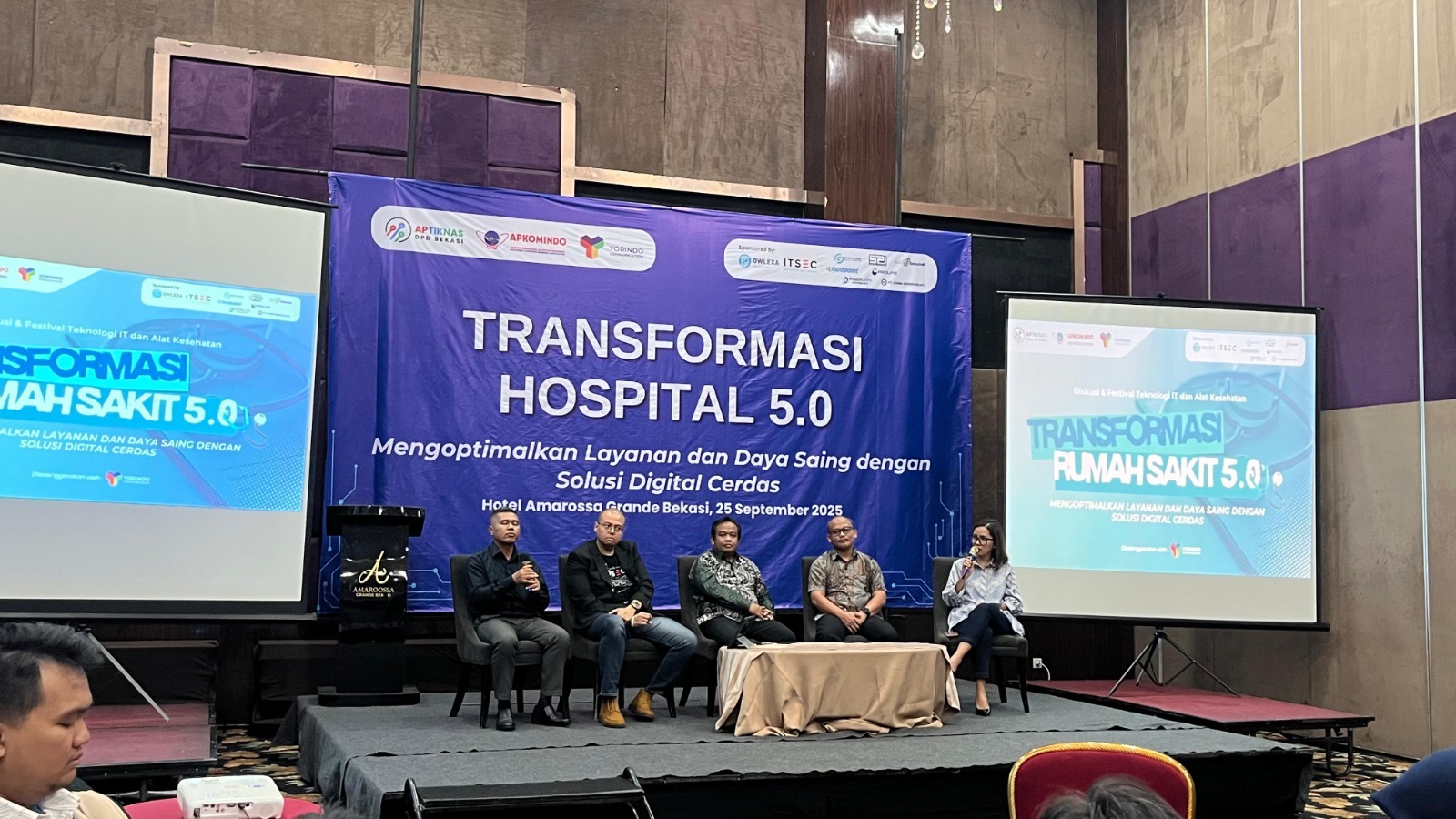 Acara mencapai puncaknya pada Diskusi Panel & Tanya Jawab dengan tema “Bagaimana Mengoptimalisai Layanan dan Meningkatkan Daya Saing melalui Rumahsakit 5.0”. Diskusi ini menghadirkan panelis dari DPD APKOMINDO Bekasi sekaligus DPD APTIKNAS Bekasi, OWLEXA AI, Utama Sinergi Sejati, dan ITSec Asia.