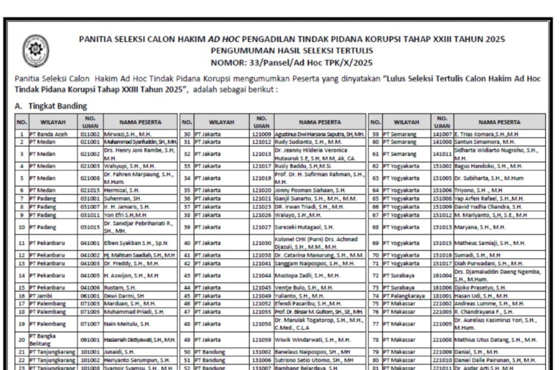 SATYA BHAYANGKARA | JAKARTA, – Kamis, 09 Oktober 2025. Sebanyak 175 Calon Hakim Ad Hoc Pengadilan Tindak Pidana Korupsi (Tipikor) dinyatakan lulus seleksi tertulis dalam rangkaian Seleksi Calon Hakim Ad Hoc Tipikor Tahap XXIII Tahun 2025. Pengumuman hasil seleksi ini tertuang dalam Surat Panitia Seleksi Nomor: 33/Pansel/Ad Hoc TPK/X/2025 yang diterbitkan pada Rabu (8/10).