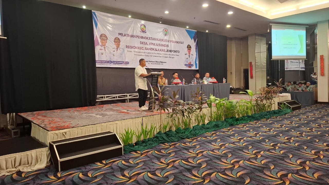 14 November 2025 — Pemerintah Kabupaten Jeneponto terus mendorong penguatan kapasitas desa melalui pelatihan peningkatan kompetensi yang digelar bagi perangkat desa, Kader Pembangunan Manusia (KPM), serta pengurus BUMDes se-Region Kecamatan Bangkala. Kegiatan yang berlangsung di Hotel Horison Ultima Makassar ini resmi dibuka oleh Pj Sekretaris Daerah Jeneponto, Maskur, S.Ag., MH., CGCAE.