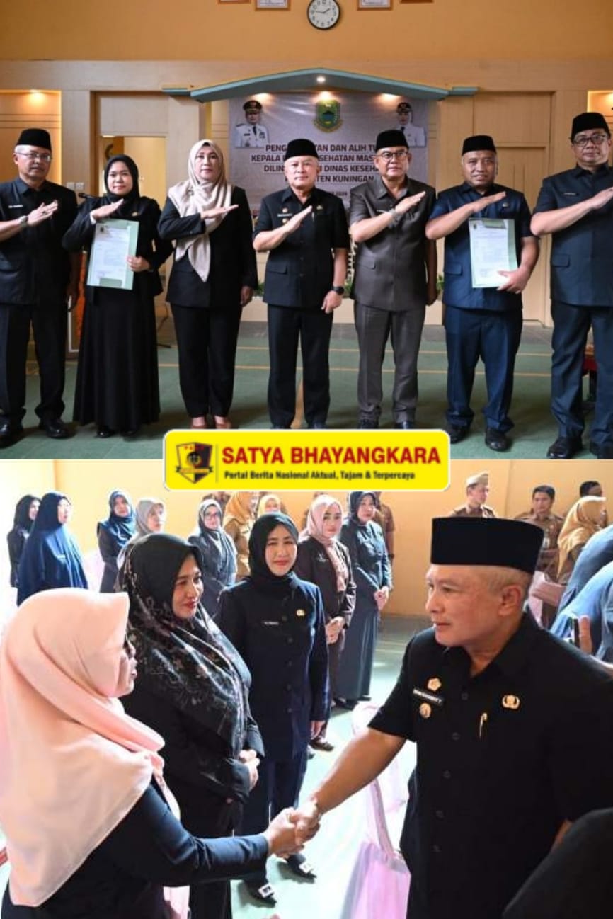 SATYA BHAYANGKARA | KABUPATEN KUNINGAN, – Bupati Kuningan Dr. H Dian Rahmat Yanuar setelah lebih dari seratus hari kerja melakukan penyegaran di Lingkup Dinas Kesehatan setelah secara berjenjang melakukan Sidak di seluruh Puskesmas se-Kabupaten Kuningan serta Penilaian kinerja Pegawai Negeri Sipil PNS sesuai Permen No 11 tahun 2017 tentang Manajemen Pegawai Negeri Sipil PNS dan Sebagai Hak Preogratif Kepala Daerah, kebijakan Bupati Kuningan Dr. H. Dian Rachmat Yanuar melaksanakan Mutasi / Rotasi Kepala Puskes Se-Kabupaten Kuningan sebagai Bentuk Penyegaran di Lingkup Dinas Kesehatan 27 Kepala Puskes yang di lantik dan pengambilan sumpah secara Simbolis pada Selasa 25/11/2025 bertempat di Aula Desa Mekarsari, Kecamatan Maleber yang di Hadiri Amih Tuti ( Wabub) UU Kusmana ( Sekda) Dr. Edi Martono (Kadinkes) Beni ( Kepala BKPSDM ) PLT Camat Maleber, Pemdes Mekarsari dan Paratamu undangan.