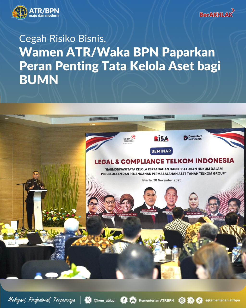 SATYA BHAYANGKARA | JAKARTA, – Pengelolaan aset pertanahan Badan Usaha Milik Negara (BUMN), jadi kunci untuk menjaga aset negara agar tetap aman dan produktif bagi keberlangsungan operasional perusahaan. Hal ini disampaikan Wakil Menteri Agraria dan Tata Ruang (Wamen ATR)/Wakil Kepala Badan Pertanahan Nasional (Waka BPN), Ossy Dermawan, dalam sambutannya di Seminar “Harmonisasi Tata Kelola Pertanahan dan Kepatuhan Hukum dalam Pengelolaan dan Penanganan Permasalahan Aset Tanah Telkom Group”, Jumat (28/11/2025).