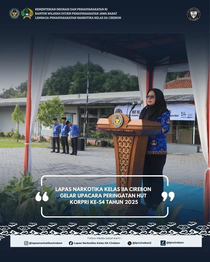 SATYA BHAYANGKARA | CIREBON, – 1 Desember 2025. Lapas Narkotika Kelas IIA Cirebon melaksanakan Upacara Peringatan Hari Ulang Tahun Korps Pegawai Republik Indonesia (KORPRI) ke-54 pada Senin (1/12). Upacara berlangsung di Lapangan Upacara Lapas Narkotika Kelas IIA Cirebon dan diikuti oleh seluruh pegawai serta para peserta magang.