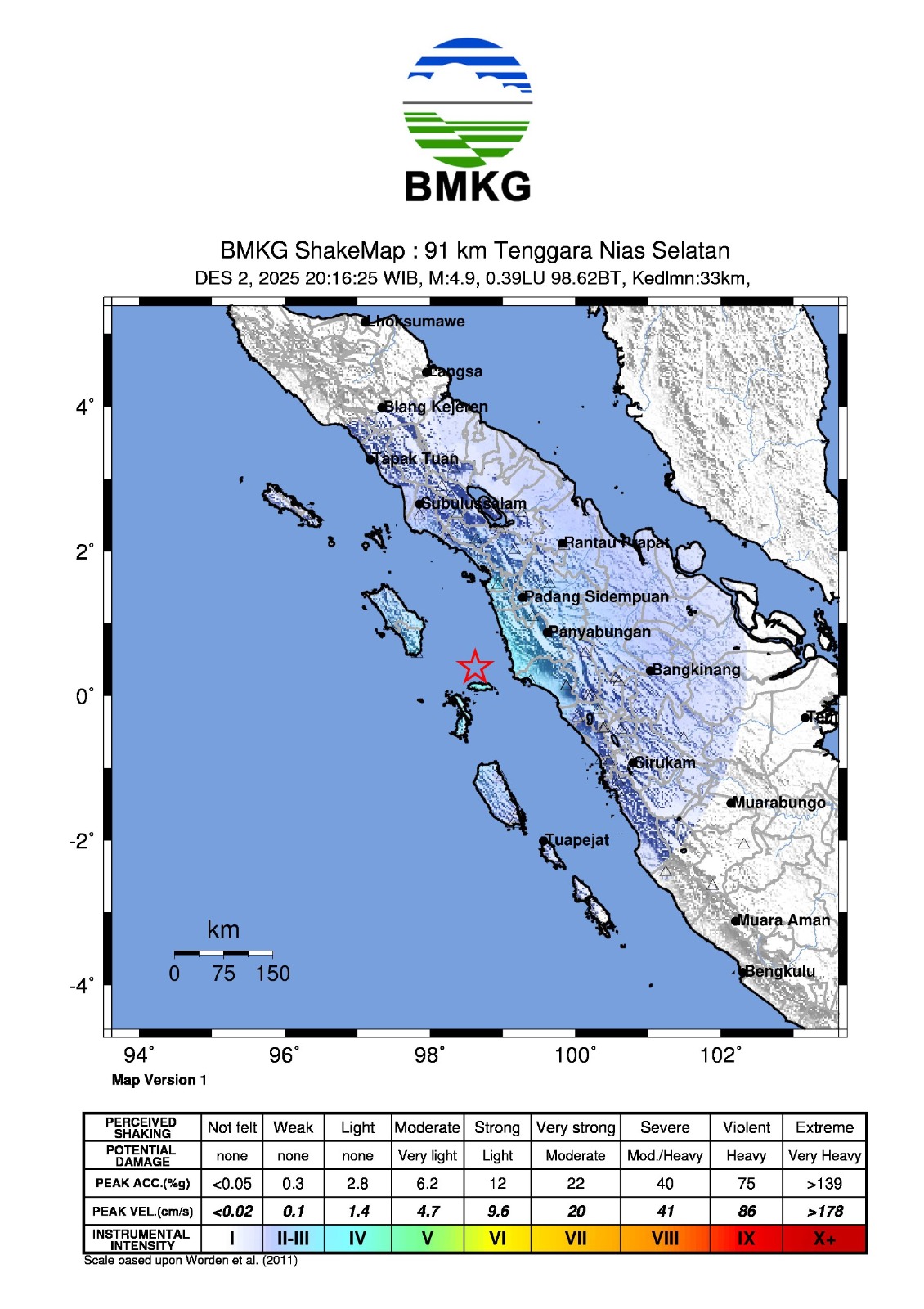 Selasa 02 Desember 2025 pukul 20.16.25 WIB wilayah Nias Selatan, Sumatera Utara diguncang gempa tektonik. Hasil analisis BMKG menunjukkan gempabumi ini memiliki parameter update dengan magnitudo M4,9. Episenter gempabumi terletak pada koordinat 0,39° LU ; 98,62° BT, atau tepatnya berlokasi di laut pada jarak 91 km tenggara Nias Selatan, Sumatera Utara pada kedalaman 33 km.