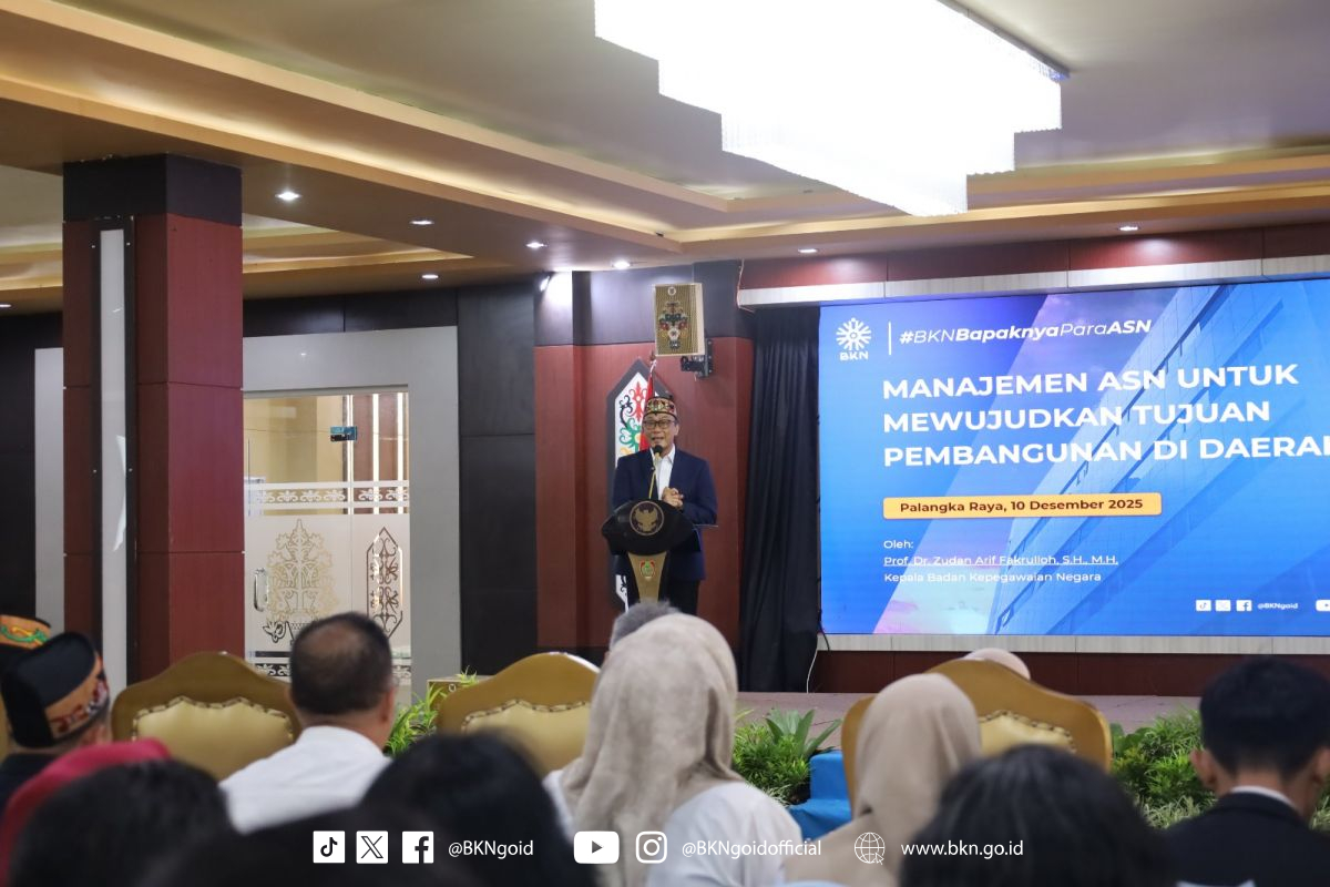 Jum’at, 12 Desember 2025. Saat menghadiri Kuliah Umum dan Penutupan Pelatihan Kepemimpinan Lingkup Pemerintah Kabupaten/Kota/ Provinsi Kalimantan Tengah Tahun 2025, Kepala Badan Kepegawaian Negara (BKN), Prof. Zudan, membawakan isu penataan ASN. Ia menekankan tata kelola ASN harus bertumpu pada manajemen talenta, kepemimpinan berempati, dan reformasi layanan yang benar-benar dirasakan masyarakat. “Paradigma ASN terbaik tidak dapat lagi dilihat dari nilai atau predikat semata, tetapi harus diukur dari kecocokan kompetensi dengan kebutuhan jabatan,” imbuhnya di Aula Kantor Gubernur Kalimantan Tengah, Rabu (10/12/2025).