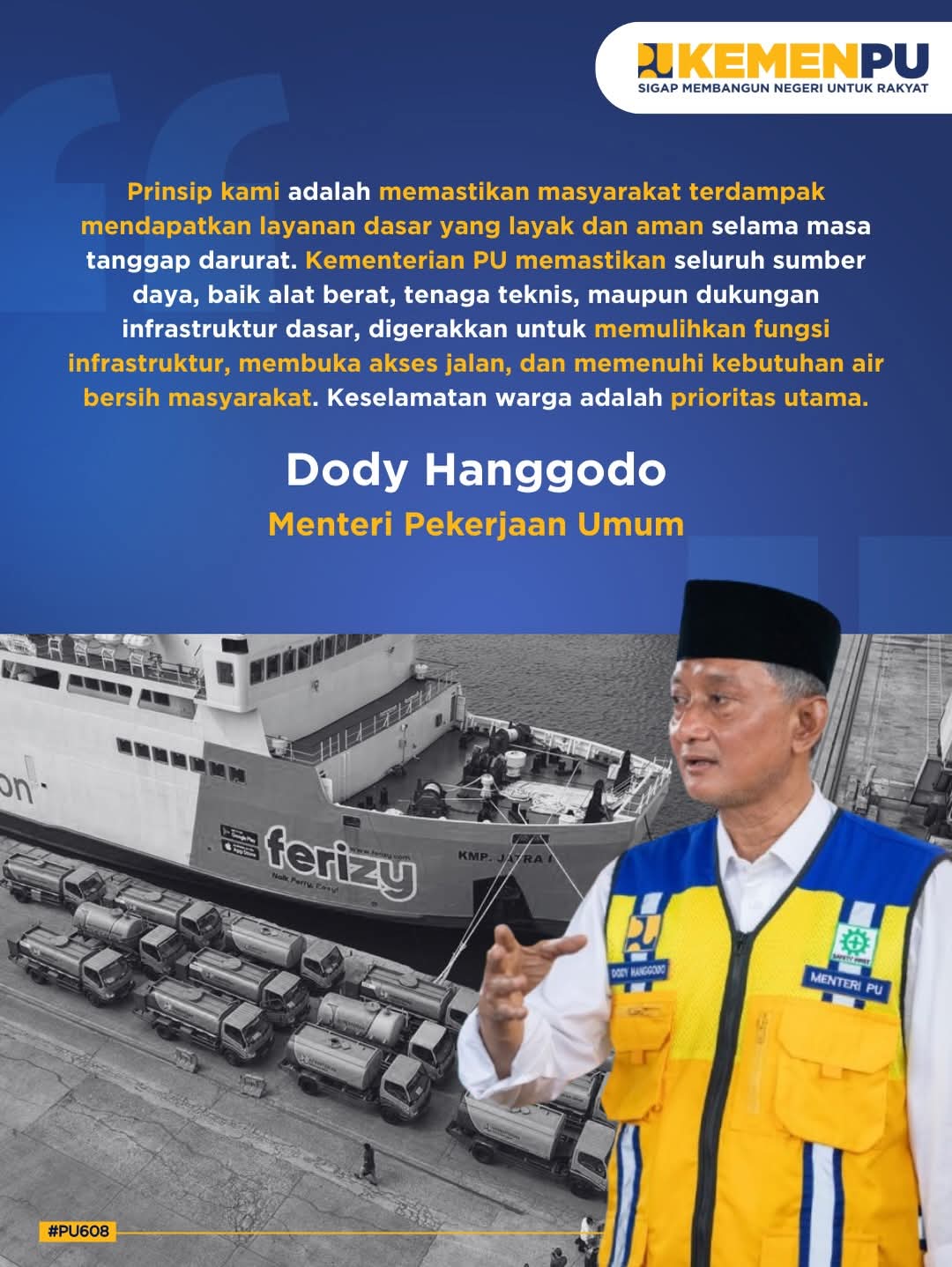 Menteri PU @dody_hanggodo menegaskan bahwa prinsip Kementerian PU adalah memastikan masyarakat terdampak mendapatkan layanan dasar yang layak dan amanselama masa tanggap darurat. Kementerian PU memastikan seluruh sumber daya, baik alat berat, tenaga teknis, maupun dukungan infrastruktur dasar, digerakkan untuk memulihkan fungsi infrastruktur, membuka akses jalan, dan memenuhi kebutuhan air bersih masyarakat. Keselamatan warga adalah prioritas utama.