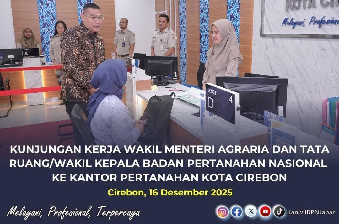 SATYA BHAYANGKARA | KOTA CIREBON, – Wakil Menteri Agraria dan Tata Ruang/Wakil Kepala Badan Pertanahan Nasional (ATR/Waka BPN), Ossy Dermawan, didampingi Kepala Bidang Survei dan Pemetaan Kantor Wilayah BPN Provinsi Jawa Barat, Arli Buchari, serta Kepala Bidang Penetapan Hak dan Pendaftaran Kanwil BPN Jawa Barat, Didik Purnomo, melakukan kunjungan kerja dan peninjauan langsung ke Kantor Pertanahan (Kantah) Kota Cirebon pada Selasa (16/12/2025). Peninjauan dilakukan untuk memastikan kualitas pelayanan pertanahan berjalan optimal serta selaras dengan kebijakan peningkatan layanan publik di lingkungan Kementerian ATR/BPN.