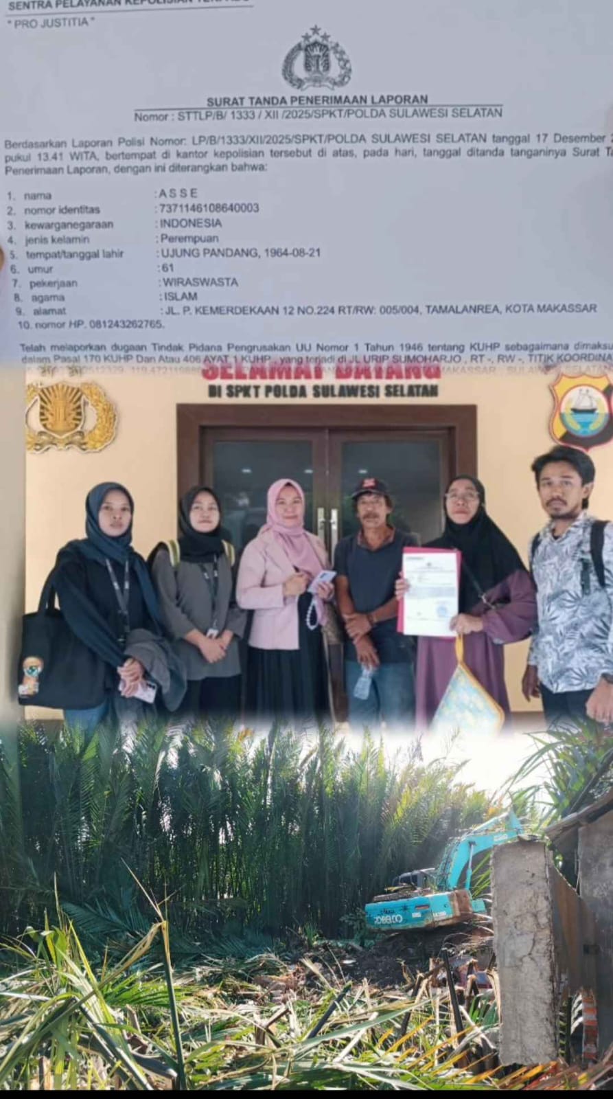 Sebagai langkah hukum yang tegas, pihak ahli waris yang diwakili Hj. Asse telah melaporkan dugaan tindak pidana penyerobotan dan pengrusakan lahan ke Polda Sulawesi Selatan. Laporan tersebut tercatat dengan nomor STTLP/B/1333/XII/2025/SPKT/POLDA Sulawesi Selatan tertanggal 17 Desember 2025, dengan pihak yang dilaporkan adalah: