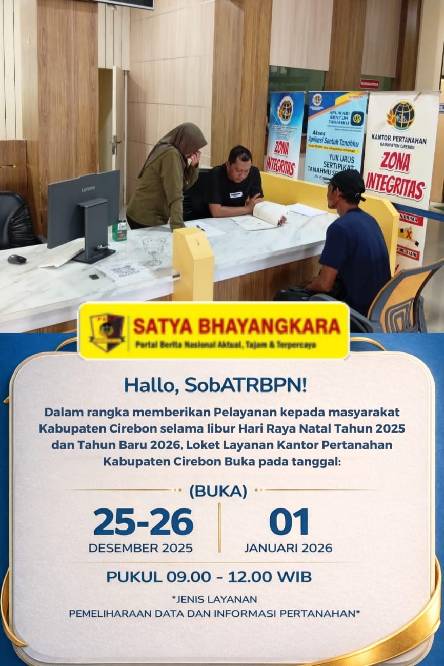 SATYA BHAYANGKARA | KABUPATEN CIREBON, – Kementerian Agraria dan Tata Ruang/Badan Pertanahan Nasional (ATR/BPN) tetap membuka layanan pertanahan semasa libur Natal dan Tahun Baru (Nataru). Jadwal pelayanan ini berlangsung pada 25 dan 26 Desember 2025 serta 1 Januari 2026. Sekretaris Jenderal (Sekjen) ATR/BPN, Dalu Agung Darmawan, mengajak masyarakat untuk memanfaatkan layanan di Kantor Pertanahan yang tetap membuka ruang pelayanan, mulai dari pengurusan hingga pengambilan produk pertanahan.