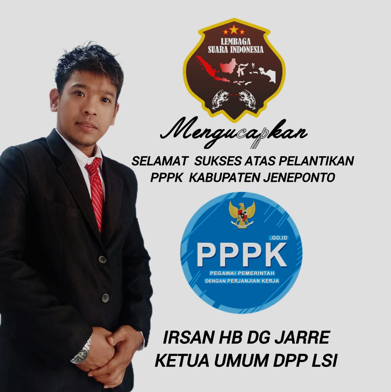 SATYA BHAYANGKARA | JENEPONTO— Ketua DPP Lembaga Suara Indonesia, Irsan Hb Dg Jarre menyampaikan ucapan selamat dan sukses atas pelantikan ribuan Pegawai Pemerintah dengan Perjanjian Kerja (PPPK) di Kabupaten Jeneponto yang berlangsung pada akhir Desember 2025.