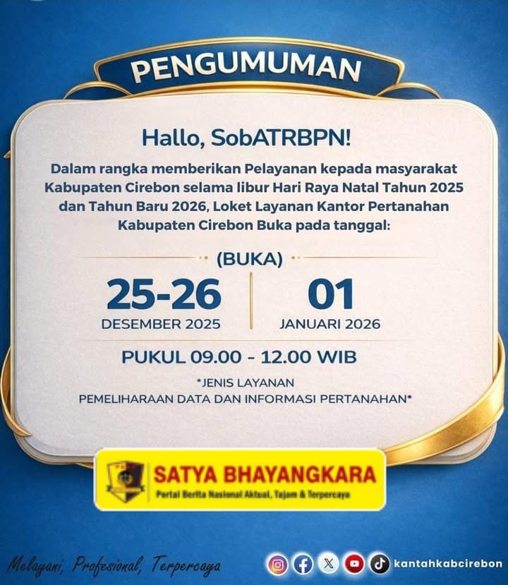 SATYA BHAYANGKARA | KABUPATEN CIREBON, – Kementerian Agraria dan Tata Ruang/Badan Pertanahan Nasional (ATR/BPN) menegaskan tetap membuka layanan pertanahan selama libur Natal dan Tahun Baru (Nataru).