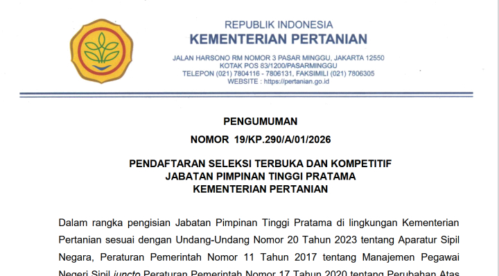 SATYA BHAYANGKARA | JAKARTA, –Selasa 6 Januari 2026. Dalam rangka pengisian Jabatan Pimpinan Tinggi Pratama di lingkungan Kementerian Pertanian sesuai dengan Undang-Undang Nomor 20 Tahun 2023 tentang Aparatur Sipil Negara, Peraturan Pemerintah Nomor 11 Tahun 2017 tentang Manajemen Pegawai Negeri Sipil juncto Peraturan Pemerintah Nomor 17 Tahun 2020 tentang Perubahan Atas Peraturan Pemerintah Nomor 11 Tahun 2017 tentang Manajemen Pegawai Negeri Sipil,