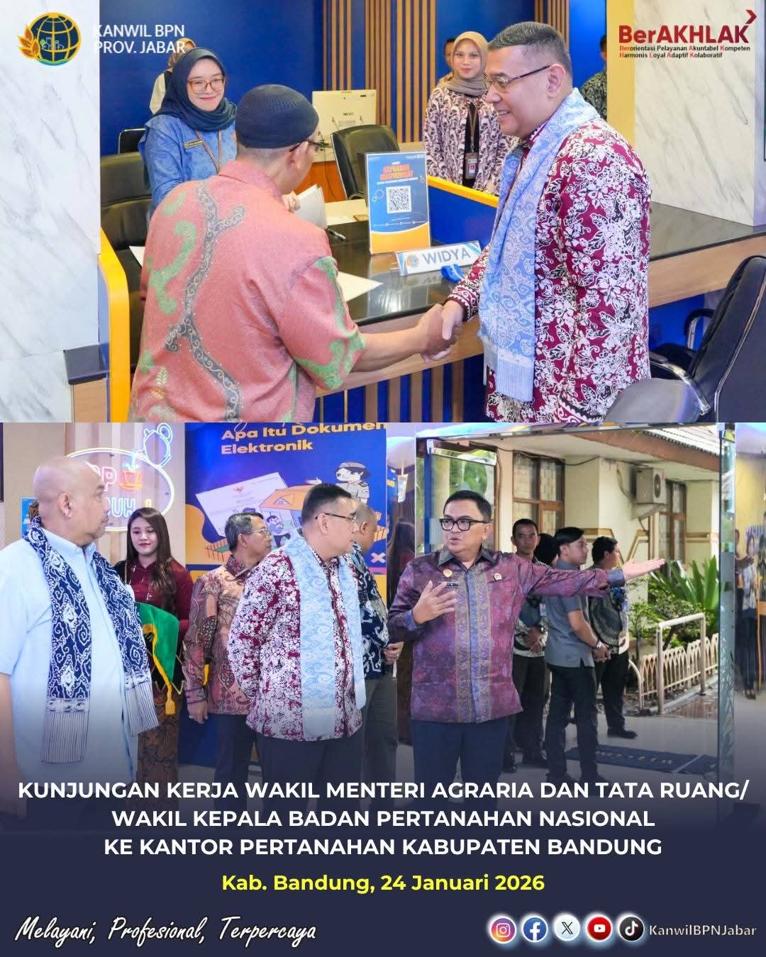 Wakil Menteri Agraria dan Tata Ruang/Wakil Kepala Badan Pertanahan Nasional (Wamen ATR/Waka BPN), Ossy Dermawan, didampingi Kepala Kantor Wilayah Badan Pertanahan Nasional Provinsi Jawa Barat, Yuniar Hikmat Ginanjar beserta jajaran melakukan kunjungan kerja dan peninjauan langsung Pelayanan Pertanahan Akhir Pekan (PELATARAN) ke Kantor Pertanahan (Kantah) Kabupaten Bandung pada Sabtu (24/01/2026).
