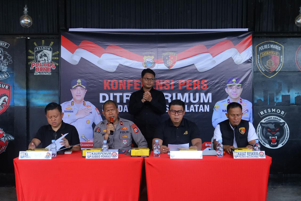 Konferensi pers tersebut dipimpin oleh Kasubdit 3 Jatanras Ditreskrimum Polda Sulsel, Kompol Benny Pornika, S.I.K., didampingi Kaur Penum Subbid Penmas Bidhumas Polda Sulsel, Kompol Andi Huseng, S.H., serta dihadiri Kasat Reskrim Polres Bulukumba dan Kasat Reskrim Polres Bantaeng.
