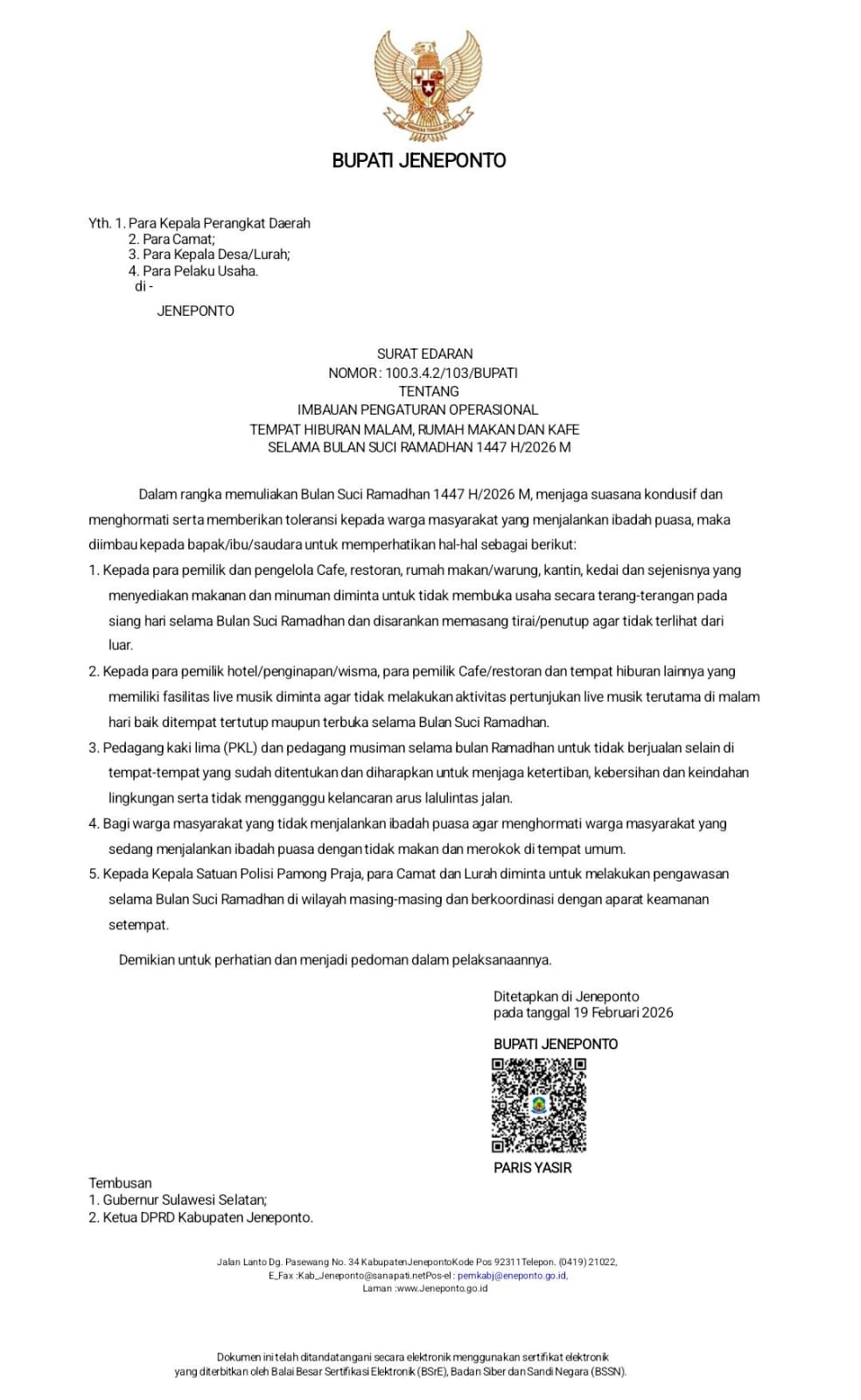 – Bupati Jeneponto, H. Paris Yasir, S.E., M.M., resmi menerbitkan Surat Edaran Nomor 100.3.4.2/103/BUPATI tentang Imbauan Pengaturan Operasional Tempat Hiburan Malam, Rumah Makan, dan Kafe selama Bulan Suci Ramadhan 1447 H/2026 M.