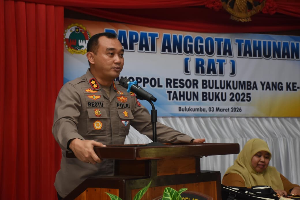 Kegiatan berlangsung di Aula Parama Satwika Polres Bulukumba, Selasa sore, 3 Maret 2026. RAT dibuka langsung oleh Kapolres Bulukumba AKBP Restu Wijayanto, S.I.K selaku Pembina Primkoppol Polres Bulukumba.