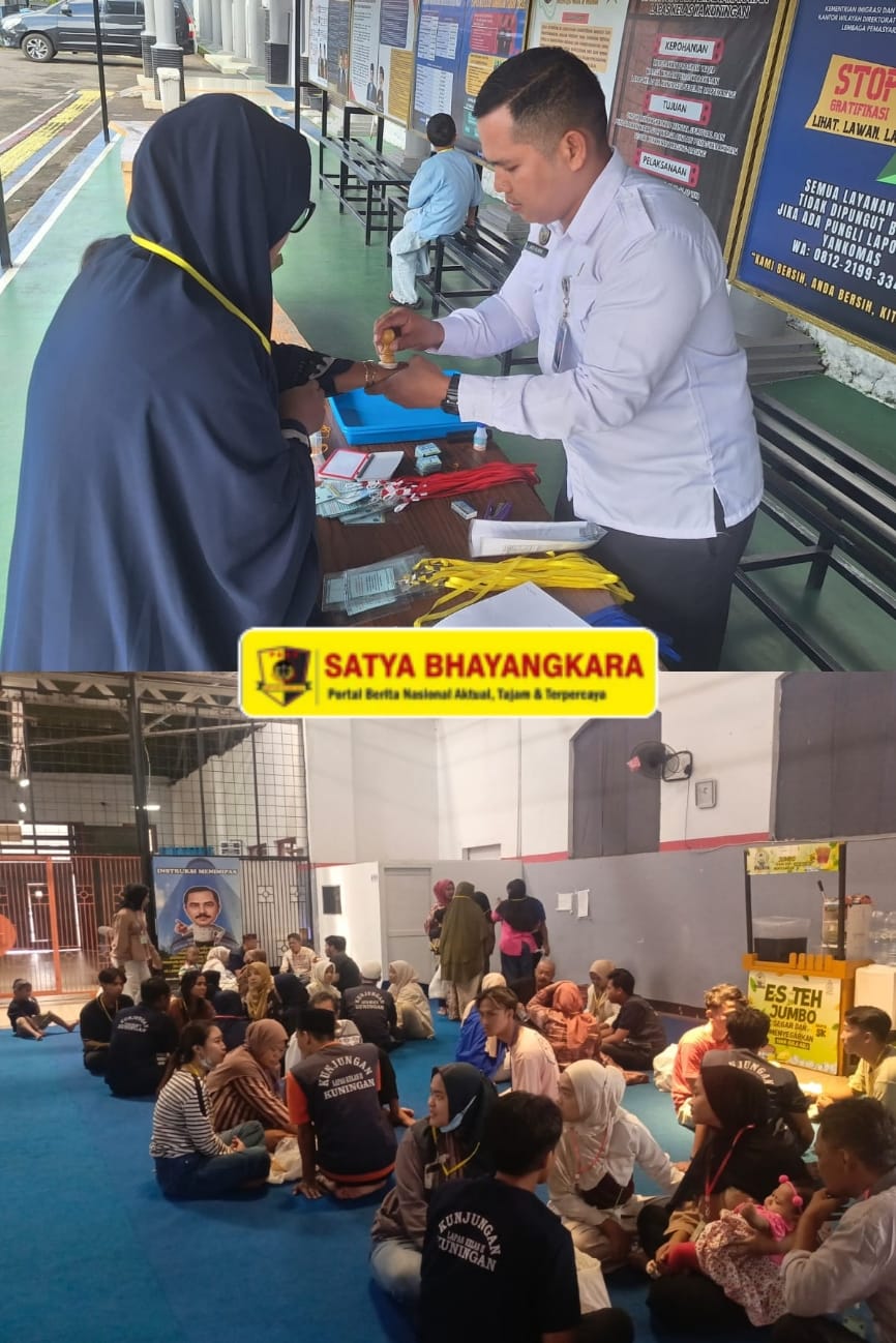 SATYA BHAYANGKARA | KUNINGAN, – Dalam rangka memberikan pelayanan terbaik kepada masyarakat dan memenuhi hak warga binaan untuk bertemu dengan keluarga pada momen Hari Raya Idul Fitri 1447 H, Lapas Kelas IIA Kuningan melaksanakan kegiatan Pelayanan Kunjungan Hari Raya Idul Fitri hari ke-2, Minggu (22/3). Kegiatan berlangsung mulai pukul 08.30 hingga 16.00 WIB di Lapas Kelas IIA Kuningan dengan tertib, aman, dan kondusif.