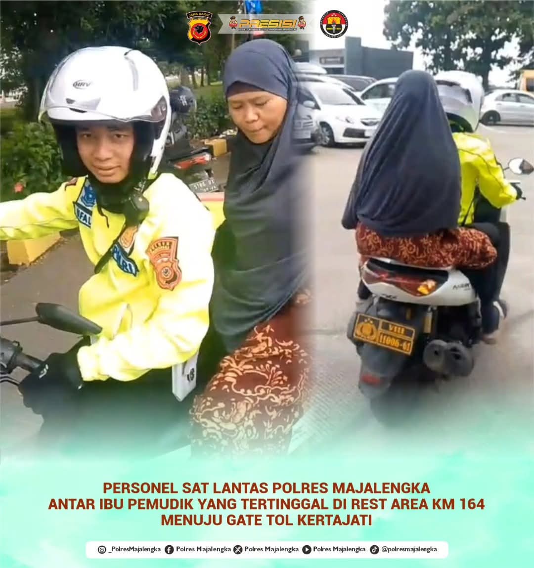 SATYA BHAYANGKARA | POLRES MAJALENGKA, – Kepedulian dan pelayanan prima kembali ditunjukkan oleh jajaran Satuan Lalu Lintas Polres Majalengka dalam mengawal arus mudik dan balik Lebaran 1447 H. Pada Jumat (27/3/2026), seorang personel Sat Lantas Polres Majalengka, Bripda Naufal Eriansyah, melakukan aksi kemanusiaan dengan membantu seorang ibu pemudik yang tertinggal oleh rombongan keluarganya di Rest Area KM 164 Tol Cipali, wilayah hukum Polres Majalengka.