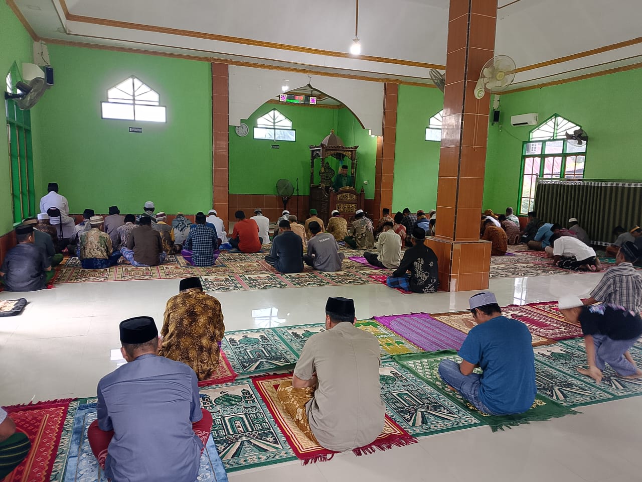 Jamaah terlihat khidmat mendengarkan, sebagian menundukkan kepala, mencerminkan suasana yang hening dan penuh hikmah sebagai bagian penting sebelum pelaksanaan sholat berjamaah dimulai.