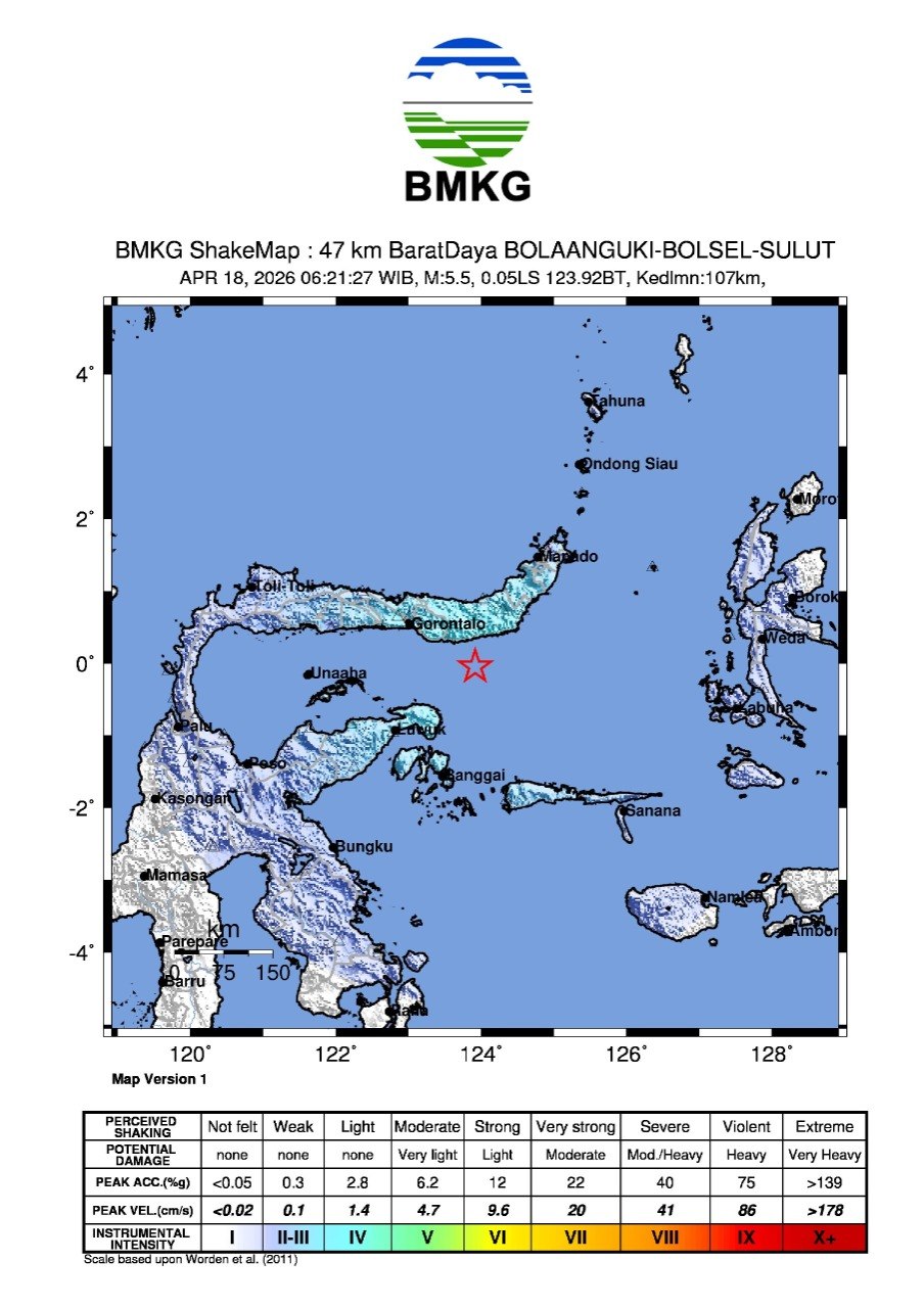 SATYA BHAYANGKARA | JAKARTA, –Sabtu 18 April 2026 pukul 06.21.27 WIB wilayah Pantai Selatan Bolaang Mongondow Selatan, Sulawesi Utara diguncang gempa tektonik. Hasil analisis BMKG menunjukkan gempabumi ini memiliki parameter update dengan magnitudo M5,5. Episenter gempabumi terletak pada koordinat 0,05° LS ; 123,92° BT, atau tepatnya berlokasi di laut pada jarak 47 km arah Barat Daya Bolaang Uki, Sulawesi Utara pada kedalaman 107 km.